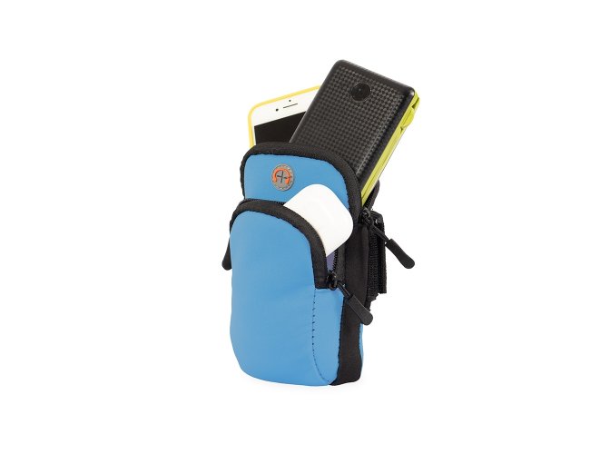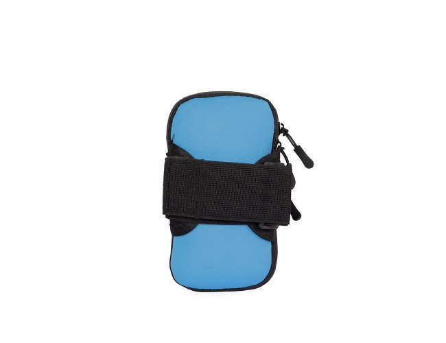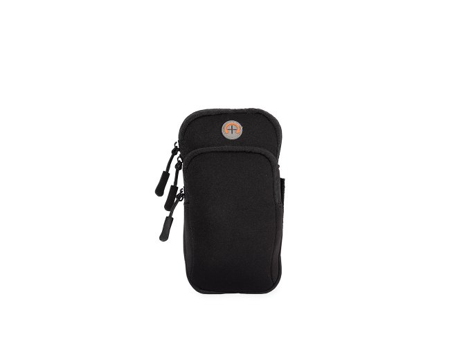 Braçadeira esportiva em neoprene impermeável. Possui dois compartimentos com fechamento em zíper: um principal, com saída para fones de ouvido, e outro na parte frontal, além de alça elástica com velcro para ajuste no braço.