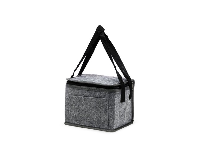 Bolsa térmica feita em feltro com capacidade para 5 litros, possui revestimento térmico, bolso frontal e alças para as mãos.